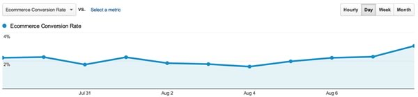 Реализация этой несложной технологии на странице оформления заказа ресурса TrafficSafetyStore привела к немедленному увеличению конверсии на 38,74% (с абсолютного показателя 2,22% до 3,08%) менее чем за 2 недели. Сплит-тест регистрировал устойчивое повышение конверсии с 29 июля по 8 августа. Эта несложная автоматизация привела к получению еще 110 заказов и дополнительных $43 230 выручки за двухнедельный период.