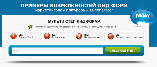 Данная опция позволит существенно увеличить конверсию и лояльность пользователей, за счет поэтапного (по мере заполнения) показа запрашиваемой информации (полей лид-формы). То есть после заполнения и отправки одного или нескольких полей, посетителю потребуется нажать на кнопку «далее» для того, чтобы перейти к заполнению последующих полей. Необходимые для ввода поля появляются на одной и той же странице.