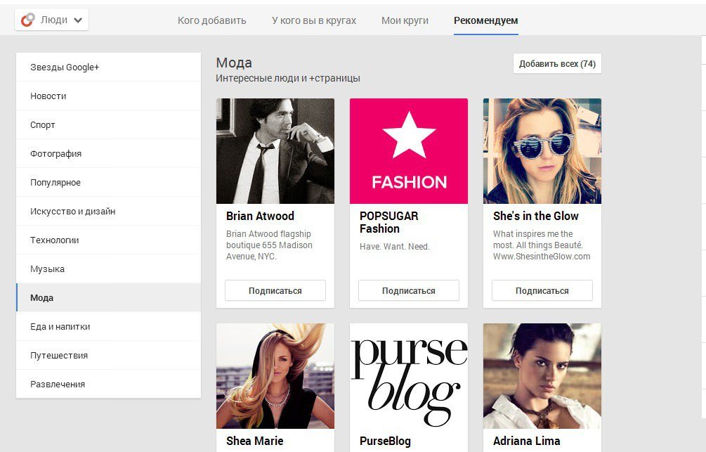 В Google+ есть вкладка «Люди», благодаря которой вы сможете найти полезные контакты. В разделе «Кого добавить», вы, в первую очередь, увидите людей, которых вы можете знать, поскольку у вас есть общие знакомые. В разделе «Рекомендуем» вам будут предложены интересные страницы в разных категориях (мода, музыка, фотография и т.д.). Например, в категории «Мода» вы сможете найти странички известных дизайнеров, моделей, модных журналов и т.д.: