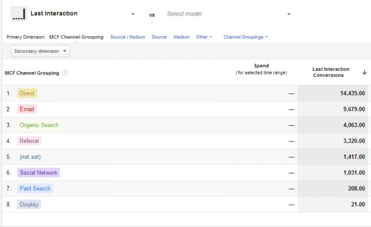 В данном случае найти эти каналы достаточно просто. В Инструменте сравнения моделей атрибуции выбираем Последнее взаимодействие и видим следующее: