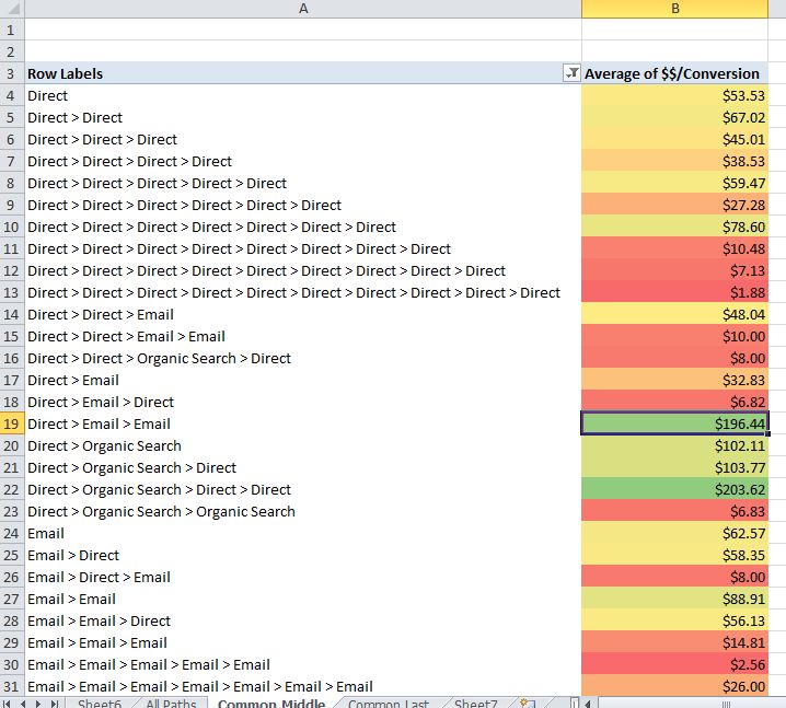 Однако это еще не дает нам полного понимания, какие каналы лучше всего работают в среднем уровне воронки. Вместо этого, данные лишь говорят нам о том, какие каналы приносят наибольший доход (что также важно знать). В нашем случае, это прямой трафик, email, органический поиск и реферальный трафик.