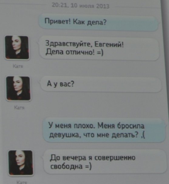 - Алексей говорит, что главное правило продаж – get out of the building (выходи и иди к своему клиенту). Как это применить профессиональным маркетологам? Поработайте в поддержке – советует докладчик. Люди, работающие там, знают очень много о маркетинге. Сначала они расскажут все о клиентах компании, а потом вы научите их продавать продукт. Затем докладчик приводит пример одного из запомнившихся диалогов в чате, где Екатерина – это сотрудник банка.