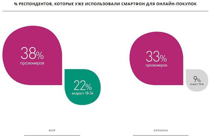 В настоящее время, 1 из 4 респондентов осуществляет покупки с помощью смартфона, но ясно, что эти цифры будут расти. Более трети наших респондентов (34% в мире и 42% в Украине) говорят, что им удобно заниматься шоппингом с помощью смартфонов. Чем больше будет создано хорошо продуманных приложений для мобильного шоппинга, тем охотнее люди будут использовать смартфоны для онлайн покупок.